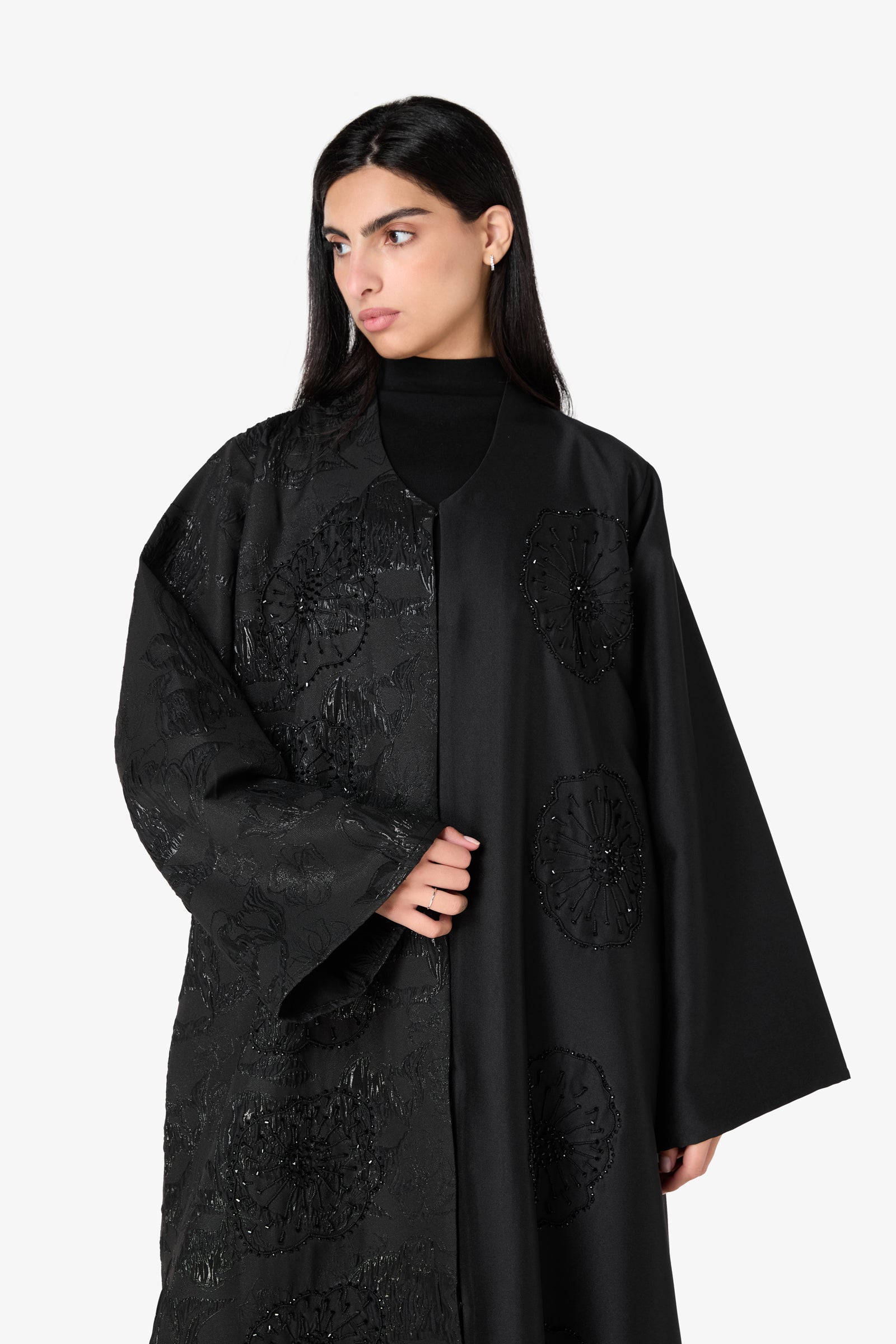 Closure: An open-style abaya that includes easy-to-use snap (tich) buttons so you can wear it closed or open.