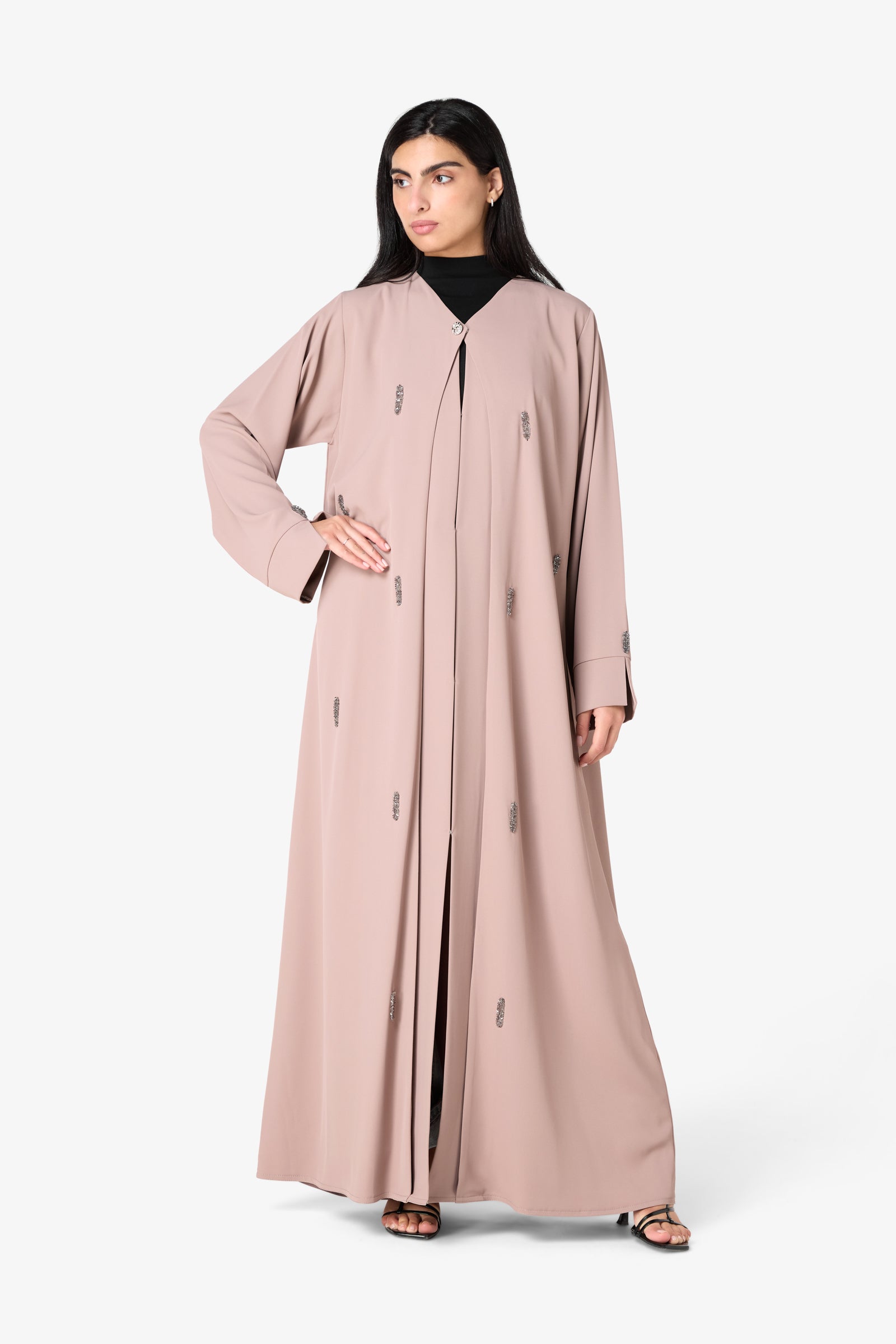 Design: A neutral beige open-front abaya featuring a minimalist silhouette adorned with intricate, scattered beaded details on the front panels and cuffs for a gentle, artistic flair.