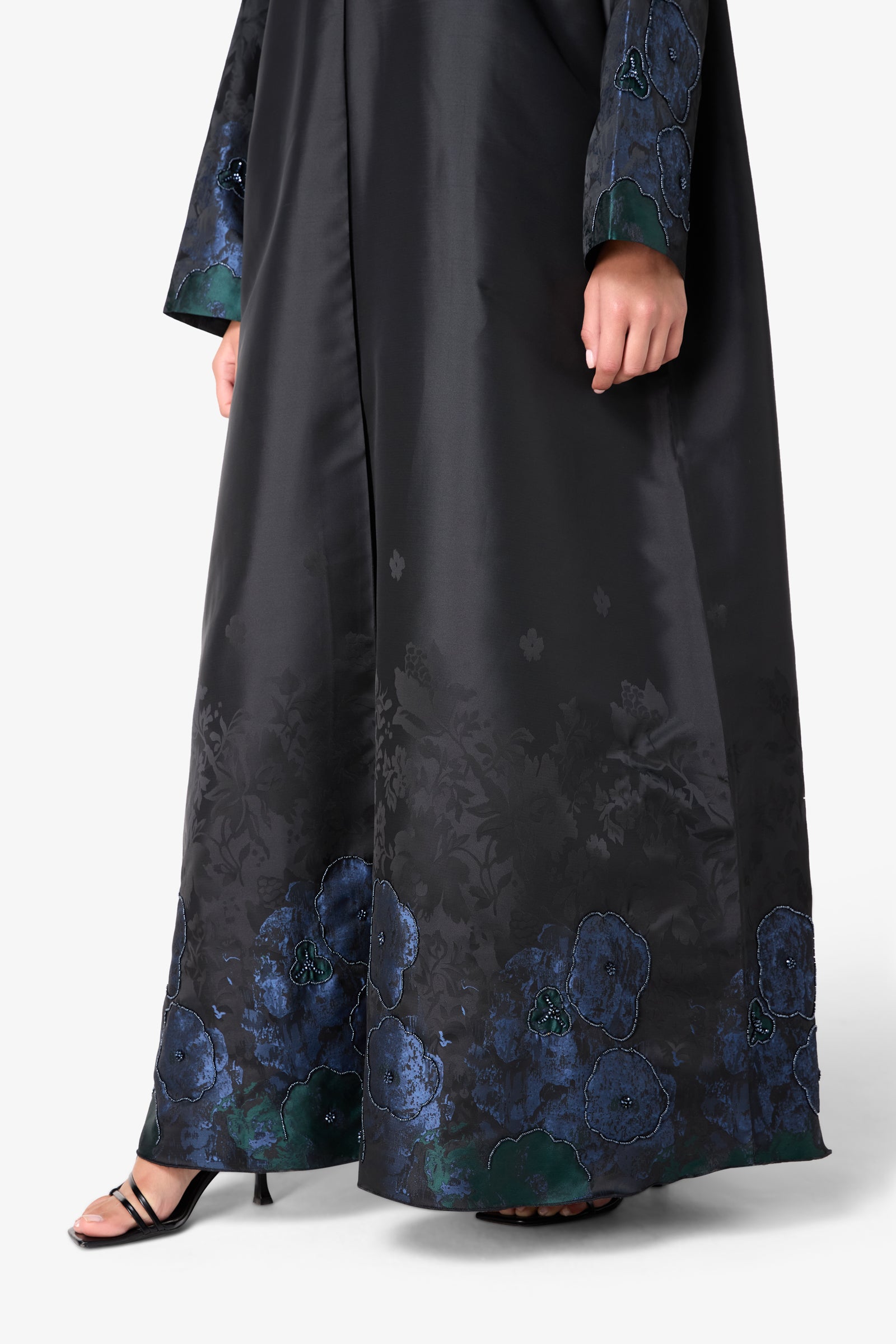 How to Wear It: Pair this abaya with simple black accessories and neutral heels to let the blue floral details really shine.