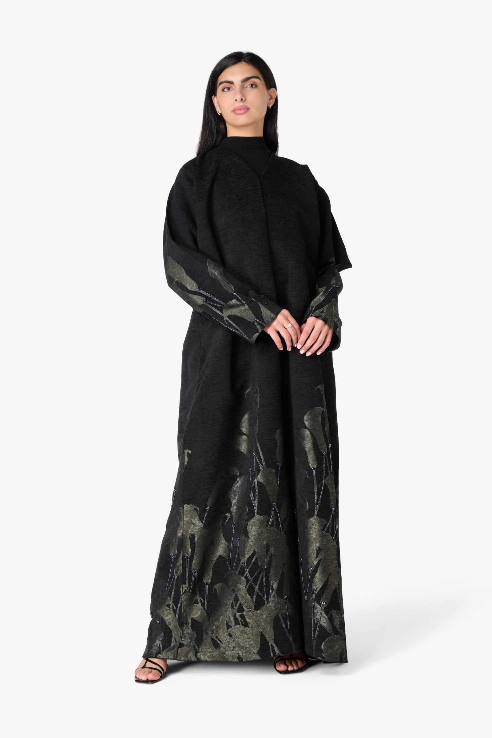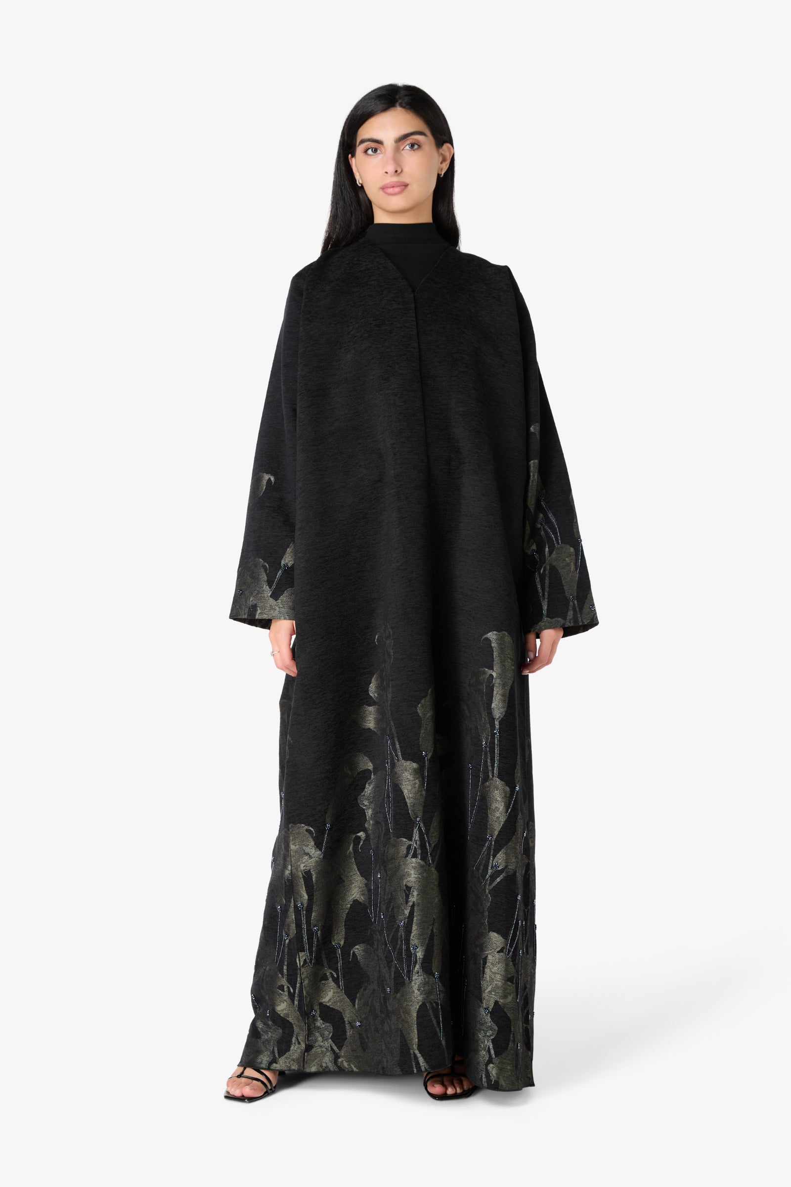 How to Wear It: Pair this abaya with simple black accessories and neutral heels to let the Olive Calla Lily details really shine.