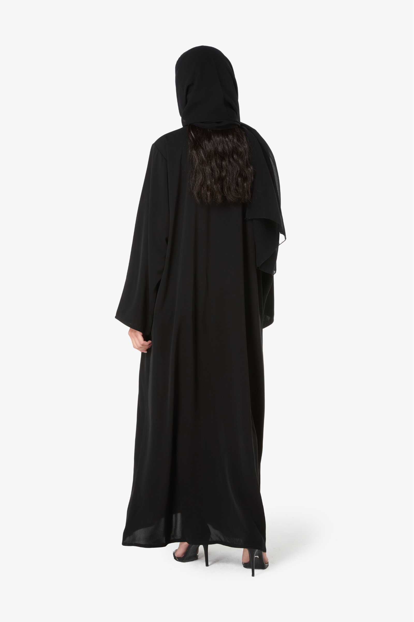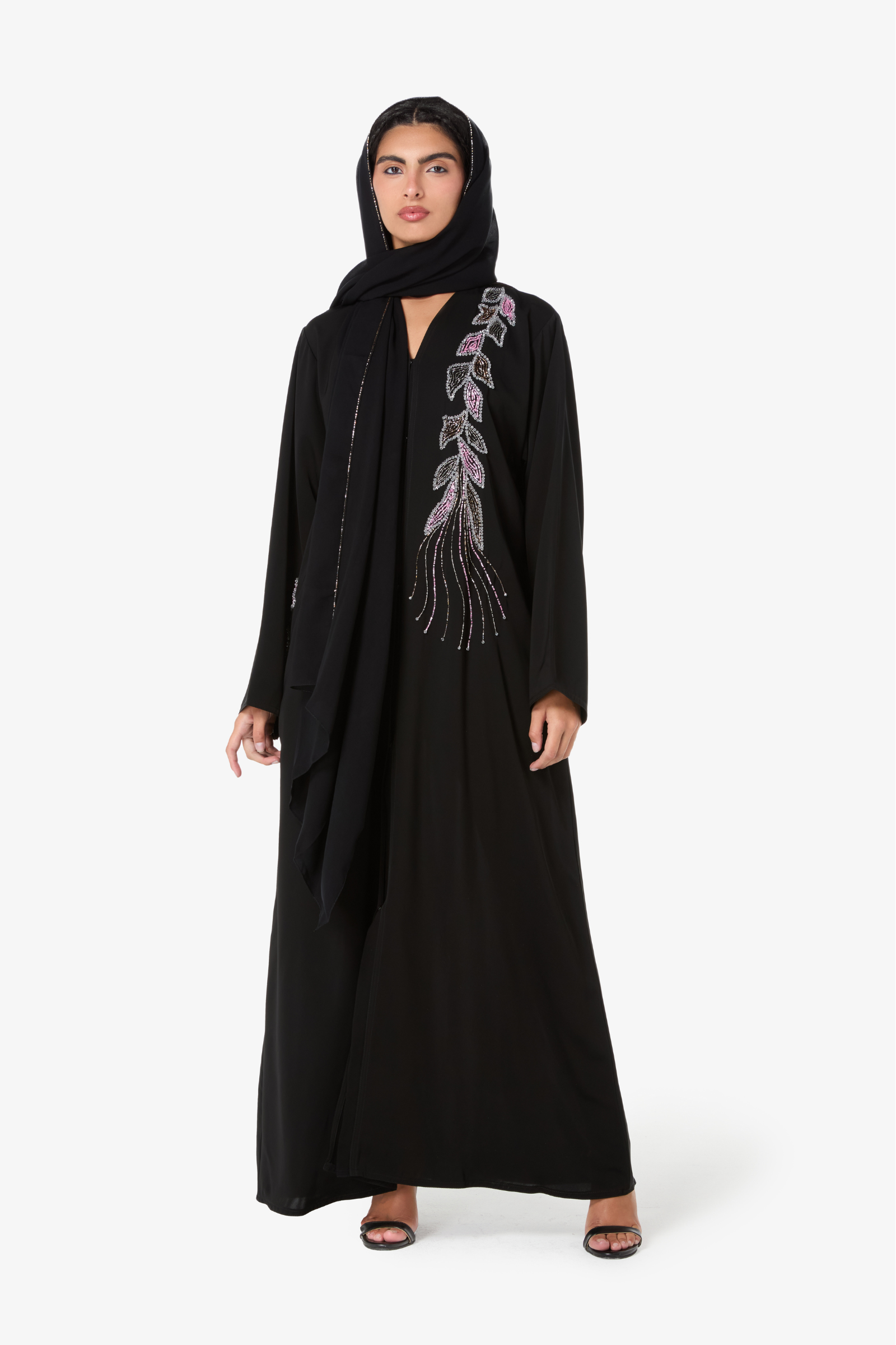 Elevate your modest ensemble with this sophisticated black abaya, featuring a delicate floral embellishment that adds a touch of subtle elegance. Crafted from a flowing, high-quality fabric, this open-front design ensures both comfort and graceful movement. The intricate floral detailing in soft pink and silver tones provides a beautiful focal point, making it suitable for various occasions. Complete with a matching black hijab, this abaya offers a refined and cohesive look.